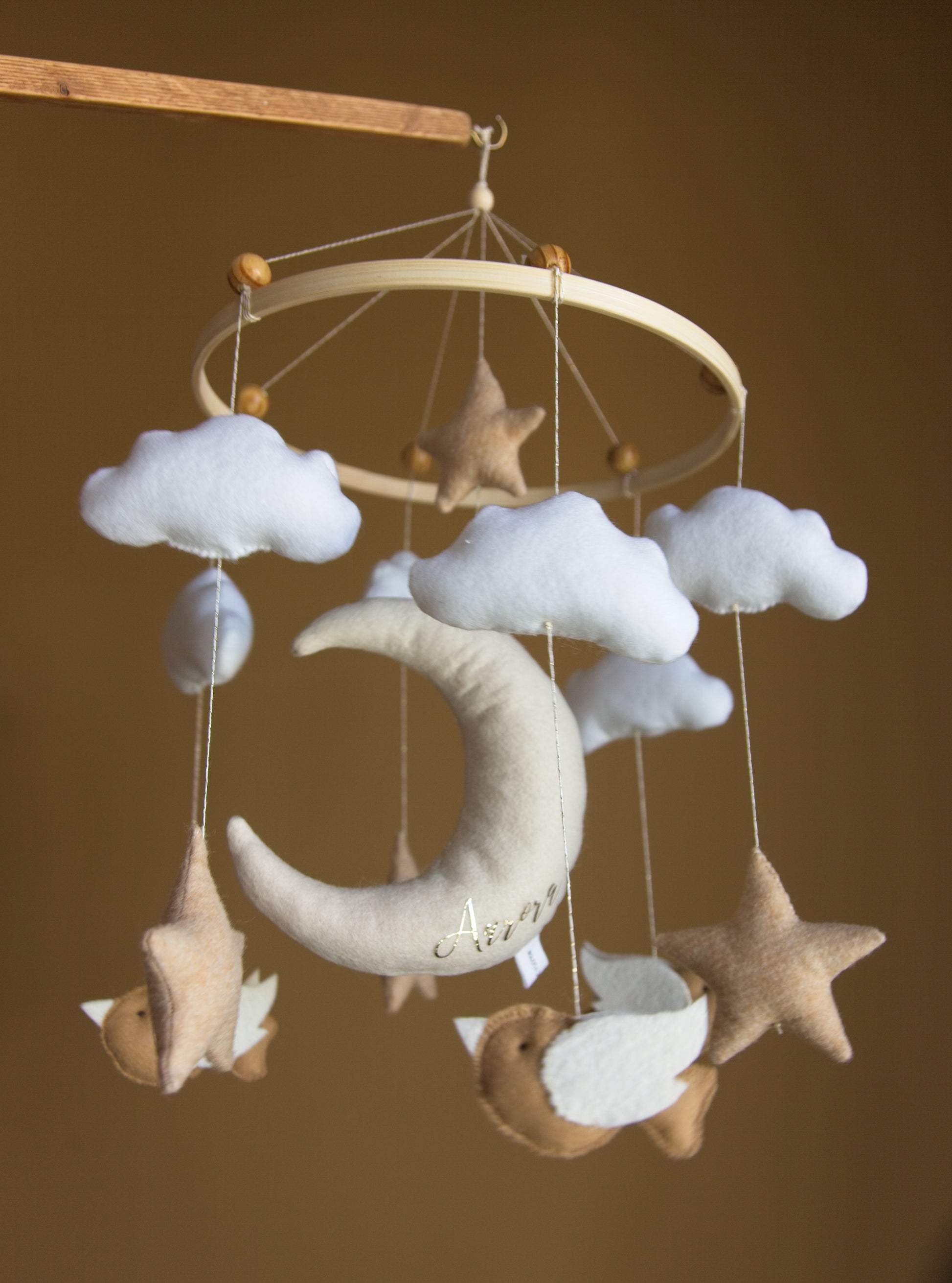 Um baby mobile em tons neutros e suaves onde pode colocar o nome do bébé.